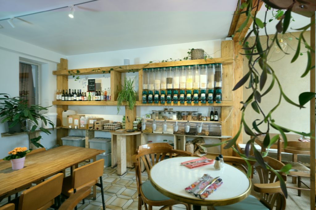 Nous avons également une sélection de vins bio que vous trouverez à côté du vrac. Les bouteilles sont consignées et peuvent être dégustées sur place ou à emporter.